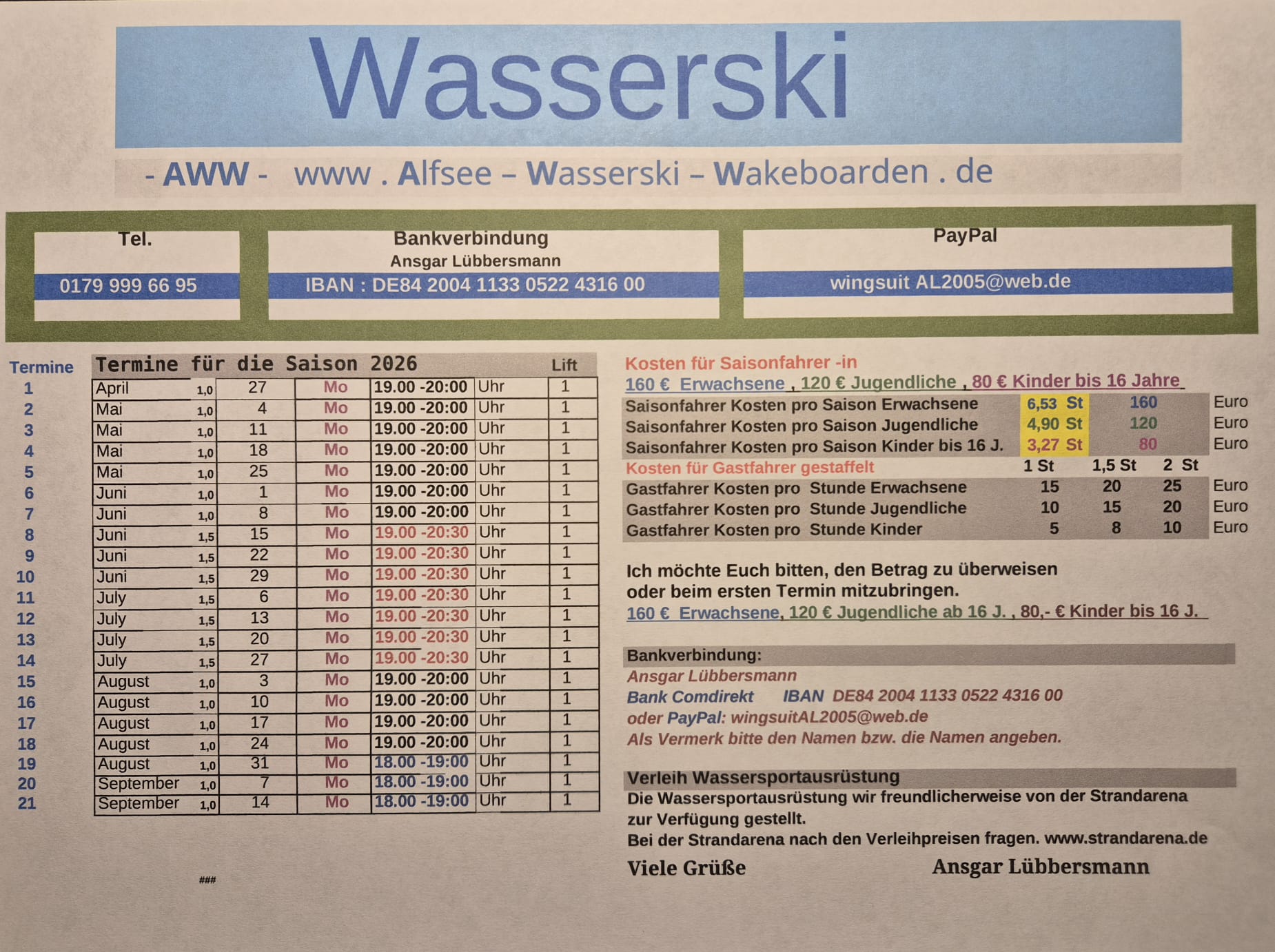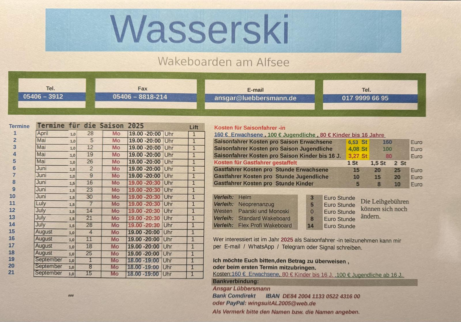 Die Anmeldung als Saisonfahrender erfolgt mit dem Zahlungseingang per PayPal oder regulärer Überweisung. Bitte im Verwendungszweck den vollständigen Vor- und Nachnamen der teilnehmenden Person(en) angeben.